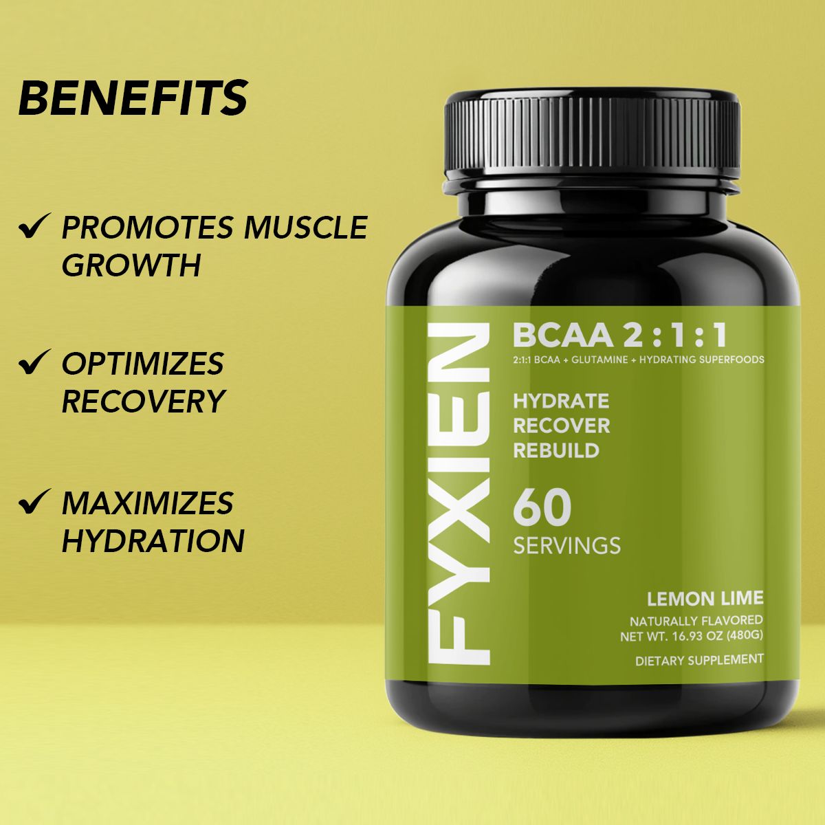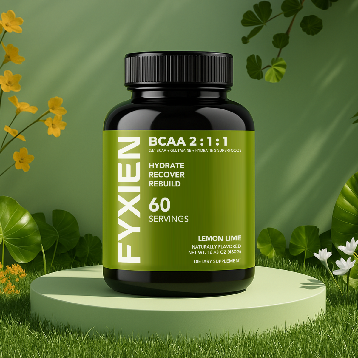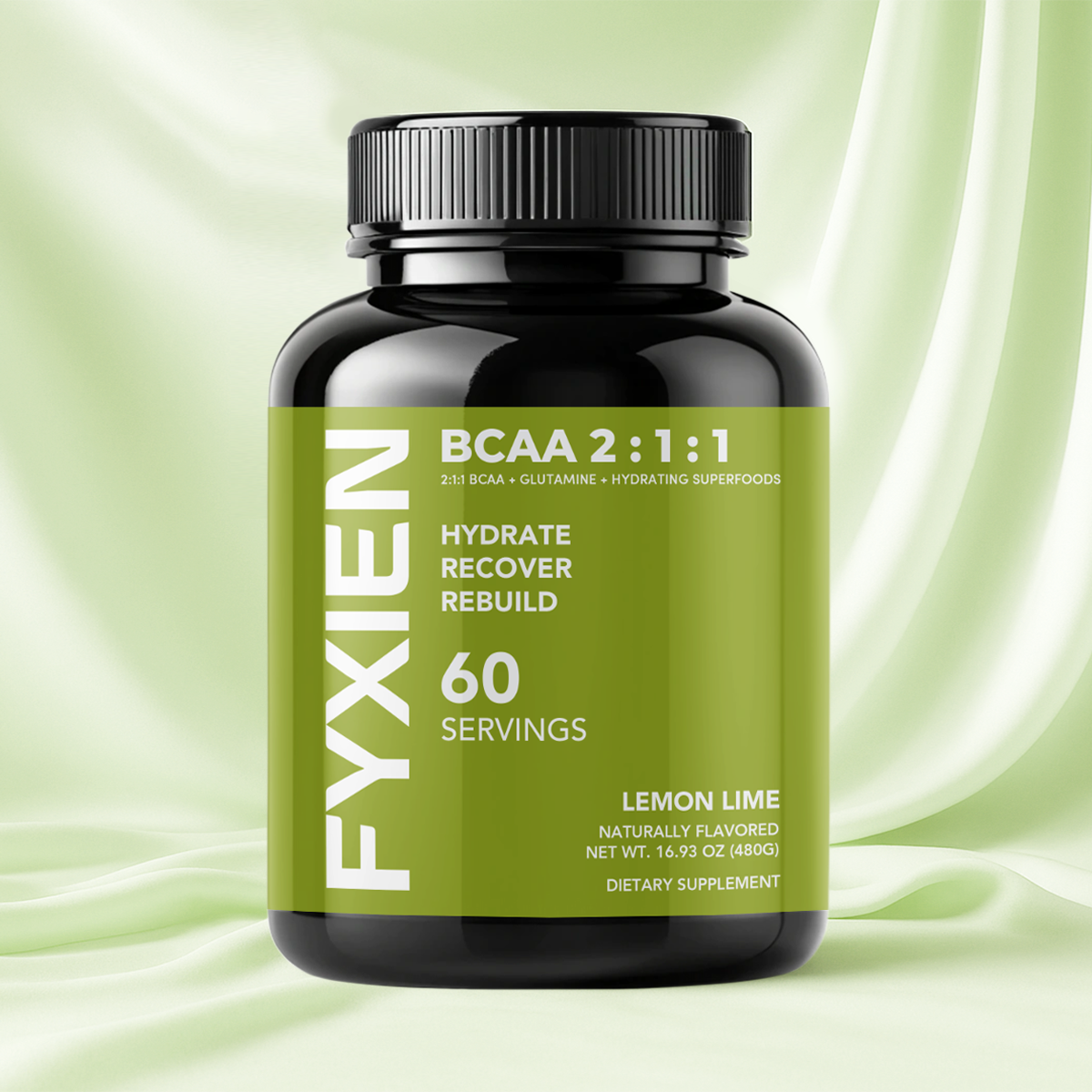 Fyxien’s BCAA is a scientifically formulated branched-chain amino acid (BCAA) supplement designed to enhance muscle recovery, improve endurance, and optimize hydration. With a potent 2:1:1 BCAA ratio of L-Leucine, L-Isoleucine, and L-Valine, plus a Recovery & Superfood Hydration Blend featuring L-Glutamine, Coconut Water, Pomegranate, Passionfruit, and Guava, this powerhouse formula helps you train longer, recover faster, and stay hydrated.